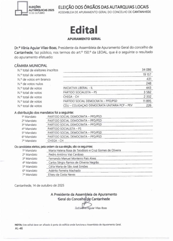 Eleição para os Órgãos das Autarquias Locais 2025 / Edital de apuramento de mandatos e eleitos